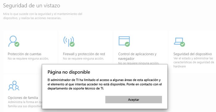 Pero si intento activar Windows Defender, sale un mensaje de que el administrador de TI ha limitado el acceso.