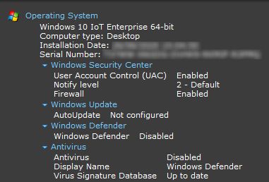 La información del OS que aparece en pantalla es la siguiente (también se aprecia que Defender está desactivado):