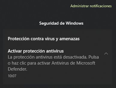 El problema es que Windows Defender aparece en la barra de tareas con un triangulito amarillo y un signo de exclamación; y en las notificaciones sale un mensaje de que active la seguridad de Windows.
