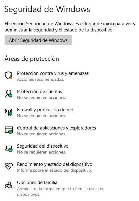 El icono de la barra de tareas aparece con un triángulo amarillo de advertencia y si voy a Configuración > Actualización y seguridad > Seguridad de Windows, en el apartado Protección contra virus y amenazas aparece el mismo símbolo de advertencia.