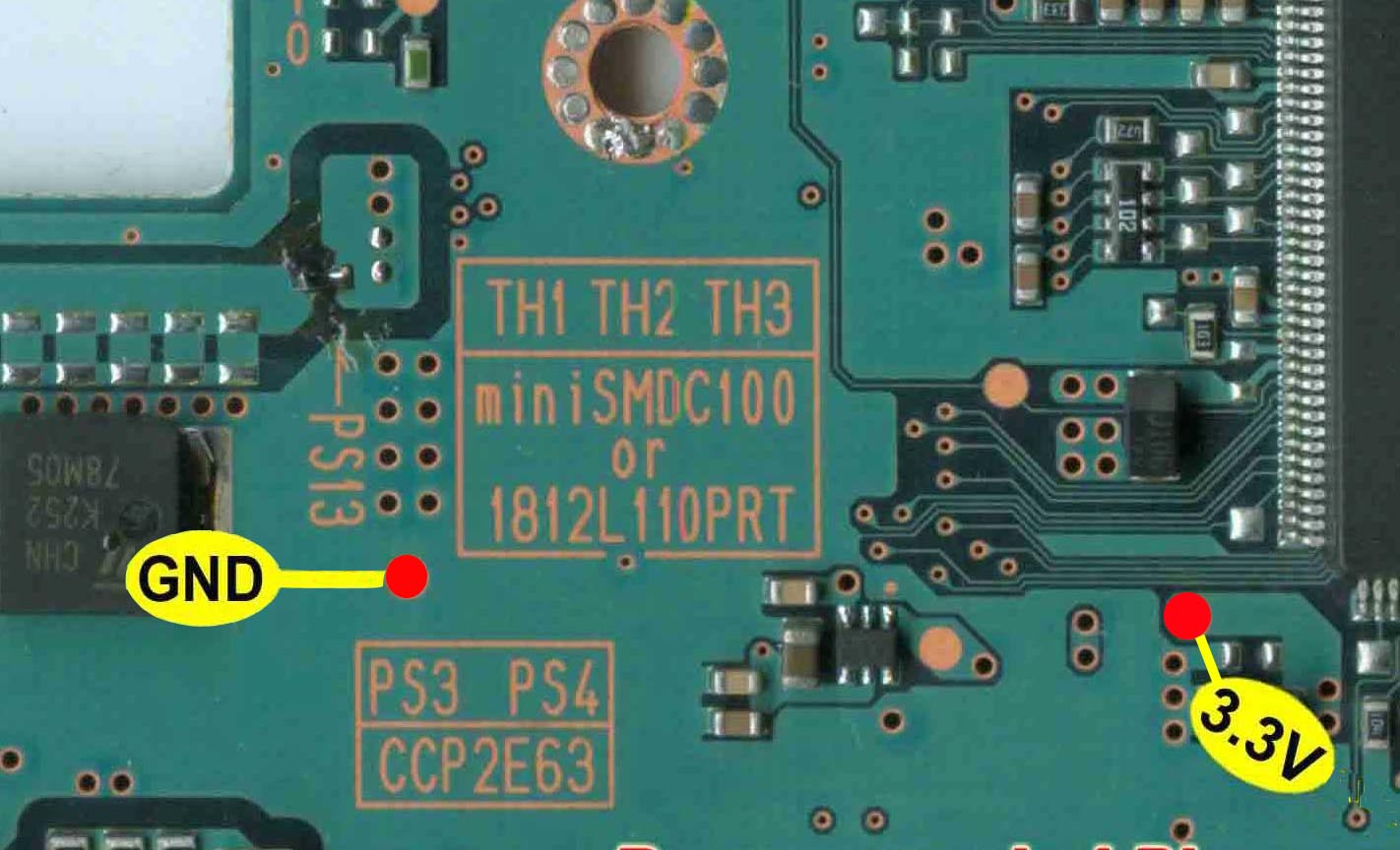 soldamos el cable blanco al punto O a la placa, y el negro a cualquier punto GND, masa, negativo, o para explicarnos mejor cualquier punto que tenga continuidad de 0 ohmios con el punto B de la placa, donde soldamos el cable b del chip.
