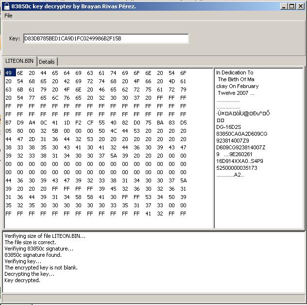 Bueno finalmente ayer conclui mi decrypter ya te permite salvar el key.bin, le agrege algunas validaciones extras y mas detalles sobre la ubicacion de la llave encriptada en el fichero y demas, solo me falta que la comudidad lo pruebe y me notifique si funciona bien, lo que si les puedo decir es que es muy comodo, otra cosa es que no tengo forma de subirlo a internet porque aunque mi correo diga arvesi.es yo no vivo en españa soy cubano y vivo en cuba, desde aca es muy dificil acceder a megaupload o rapidshared, lo ideal seria que alguien me diera su direccion de correo, yo se lo envio y esa persona lo sube a algun servidor de descarga de los antes mencionados.....