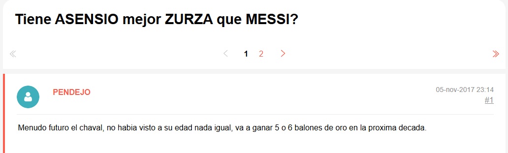 Si hablamos del nivel maximo pa que gane balones de oro, aun no lo veo a ese nivel, que es el que espera mucha gente o el que dice en el que ya está alguna gente en la actualidad, no está ahi, pero no lo olvidemos, aun tiene 17 años, desde los tiempos de Raul Gonzalez, no veias un jugador de ESpaña que dijeras este tio pinta a estrella mundial si o si con su primeros pasos en el futbol.