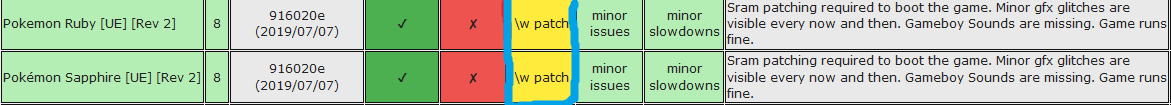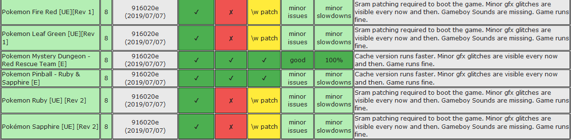 Como dije, el Zafiro/Rubí ya los parcheé con el programa. Al abrirlo con el GBARunner del propio menú, se queda en negro, pero si lo abro desde el Runner de la raíz si funciona. El problema es que NO deja guardar y en la lista de compatibilidad dice que sí.