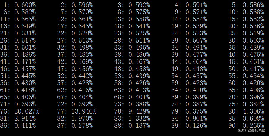 Si fuesen % de probabilidad entonces en la 90 debería ser un 100% y es solo un 0,265% porque es difícil q no te haya salido ya antes en el subpity.