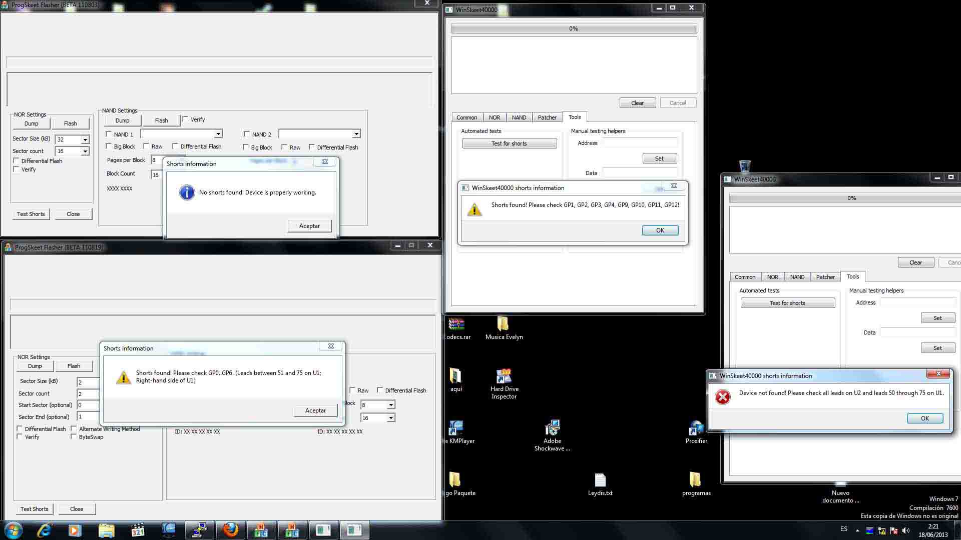Coloqué el progskeet a la placa, con nuevos cables y lo más corto que pude casi me fue imposible, instalé en un disco que tenía a mano un xp sp3 limpio con los drivers y programas necesarios para lo que me proponía , realicé 3 dump con el mismo resultado de los anteriores, todos iguales. Al ver que no había mejoras opté por realizar lo que me recomendó luckymas: le di formato al disco en el pc y con el mismo DVD que se había actualizado, le di caña nuevamente, tamaña sorpresa me llevé cuando volví a realizar otros nuevos dump(15), que no eran iguales a los otros, esos 15 eran iguales entre sí y ya estos eran asimilados de otra manera por el BwE_NOR_Validator_v1_31, el FlowRebuilder v.4.1.3.2 trabaja bien con la opción(Extract a Byte reversed NOR dump or an interleaved and unscrambled NAND dump.