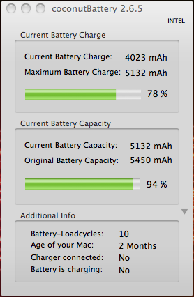 Una vez cargado lo uso hasta que entra en suspension/hibernacion por si solo. Cargo la bateria con el portatil apagado y al encenderlo el coconut me pone que la capacidad maxima de la bateria es del 95% cuando al sacarlo de la caja era de 98%. Ahora esta con la bateria cargada a tope y lo uso conectado a la corriente. Esta diferencia es algo normal al principo ? el coconut falla ? mi macbook es defectuoso ??