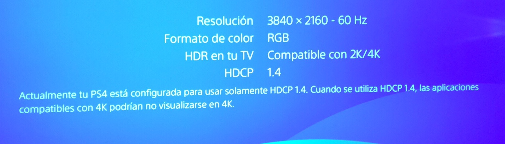 Se oye pero no se ve nada , he iniciado en modo seguro y al cambiar a HDCP 1.4 consigo que se vea, pero la tele es compatible con HDCP 2.2 y el cable hdmi es el que trae de la ps4 pro. La TV tiene los 3 puertos HDMI activados con función Hdmi ultra hd deep colour. Estoy jugando al ffxv y me detecta la señal HDR el cual tengo activado , pero al estar con HDCP 1.4 en ves del 2.2 que trae de forma automática la consola creo que estoy perdiendo calidad a pesar de q ya se ve genial.