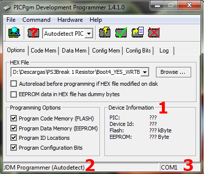 Esta mañana me he puesto al trapo para hacer la modificacion de una resistencia facilitada por ozopino. He metido en mi pic (con cutreprogramador sin transistor y el programa PICpgm) el boot que facilita ozopino en este rar: http://www.elotrolado.net/hilo_hex-del-ps3break-1-0-pic-sacado-para-su-estudio-tutorial_1492857_s370#p1722000955. He marcado las casillas wrtc y wrtb para proteger el boot.
