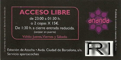 Plan: entrada a Ananda con flyer que os dejaré puesto por aquí y que os enviaré también por correo por si acaso. Como vamos el jueves, con dicho flyer tenemos entrada gratis+copa. Tengo que llamar al rr.pp a ver si nos puede meter en lista para acceder a la sala VIP, por eso necesito que me confirmen los que quedan antes del jueves al mediodia. Además es importante recordaros (sobretodo a los chicos) que hay que ir bien vestidos para entrar
