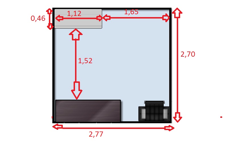 gsxr_46 escribió:Hola de nuevo espeto de sardinas , pues tal y como puse en el “intento” de plano, de pared a pared cuento con 3,70 metros de largo pero jugare separado de la pared con lo cual cuento con 3 metros de largo y de ancho 2,77.Y en la pared donde iria la pantalla de ancho es 2,77 y de alto 2,70 Me gustaría ponerlo en el salón donde cuento con mas espacio pero no podría jugar cuando quisiera etc. Un saludo y gracias!!!