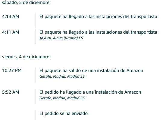 Ps5 disco pedidos el 19 a las 15:07, fecha de entrega 12 de diciembre , sin movimiento de ese estado hasta ayer que cambió en reparto, todo era alegría , toda la mañana en casa esperando , tu pedido está a 8 paradas, (repartía Amazon logístic), tu pedido está a 1 parada, el repartidor tiene que dejar algunos paquetes antes de ir a tu dirección y a las 15 horas de la tarde , el paquete ha sido entregado, OMG, inmediatamente llamo a Amazon, y dicen que estudiarán el caso, posteriormente me escriben que el repartidor confirma que el paquete se dejó en mi casa, vuelvo a llamar y me dicen que no me preocupe que estoy cubierto y me enviaran otra o devuelven el dinero, que los de de tiempo hasta el martes para investigar qué ha pasado.