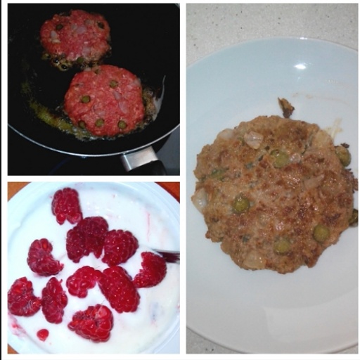 He hecho hamburguesa casera con cebolleta y pepinillos en trocitos, carne picada, pan rallado y yema de huevo.... Y de postre...yogur griego con frambuesas naturales ñaaam ñaaaam!!!
