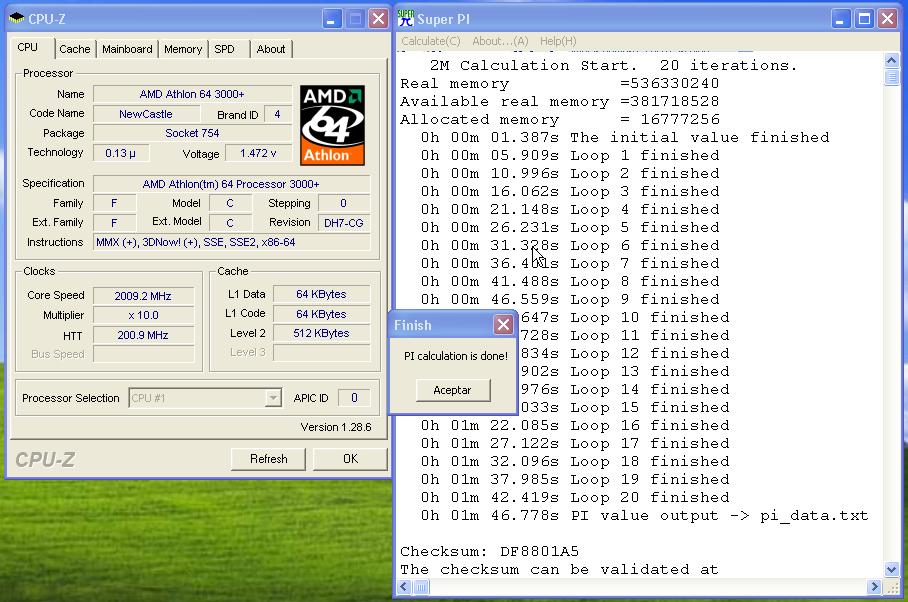 EDITO: Tengo problemas... el prime solo aguantó 3 horas. El sm aguanta todo el cpu, pero las mems da 1 error... tendré que configurar mejor algún timming (pero me pasa 23 test 8 del memtest...) El occt.. no aguanta nada!!! y subiendo vcore no se soluciona.. pa mi k son las mems, o la config de estas.