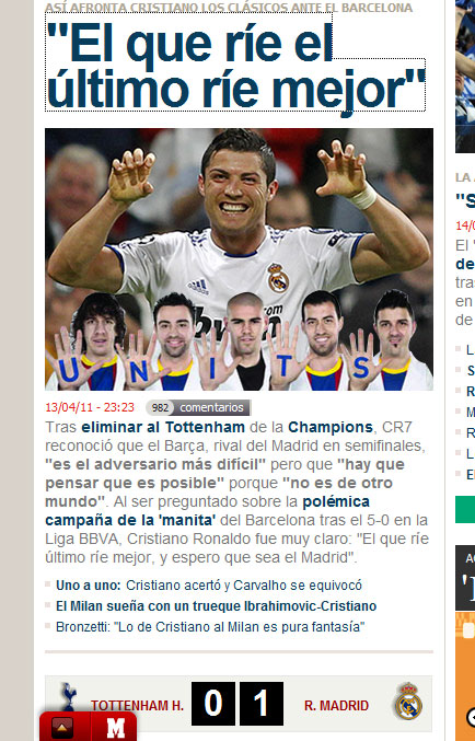 + a partir de ahí y con canguelo y villarato ya con fecha de caducidad, vemos esperpénticas estrategias como que en el barça se dopan, las lamentables ruedas de prensa de mourinho... que esa es otra, mourinho se mete y pelea con todo dios y "ya era hora de que alguien dijera la verdad". Mourinho odiado por todos los entrenadores y Cristiano pitado en todos los campos. "Es por envidia". Curioso que a Guardiola le quieran todos y a Messi le aplaudan. Pero a ellos ya les conviene creer que es envidia, y no que ese odio se lo buscan con su prepotencia, tanto mourinho como Cristiano. Piqué si que es prepotente levantando 5 dedos con su afición. Cristiano, pidiendo al público rival que le pite más? Eso es cariño.