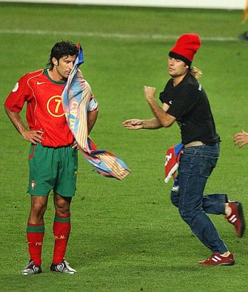 En el minuto 86, cuando Portugal se volcaba en busca del empate, saltó al campo un espontáneo, un tipo absolutamente imbécil con una barretina y una bandera del Barcelona que arrojó contra Figo. Cuando le perseguían los miembros de seguridad se lanzó hacia la red como si fuera un balón, a punto estuvo de degollarse con la red. Al ser retirado del campo perdió el gorro y se pudo comprobar que tenía la cabeza hueca.