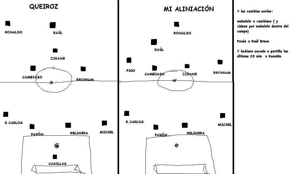 - Figo estaba bien por la derecha pero... ¿no hubiese sido mejor, figo por la izquierda, Ronaldo delantero centro donde ha estado Raúl, Raúl en punta y Beckham por la derecha, y porsupuesto Zidane y Cambiaso o makalele por el centro, en vez de Zidane en media punta como ha estado.