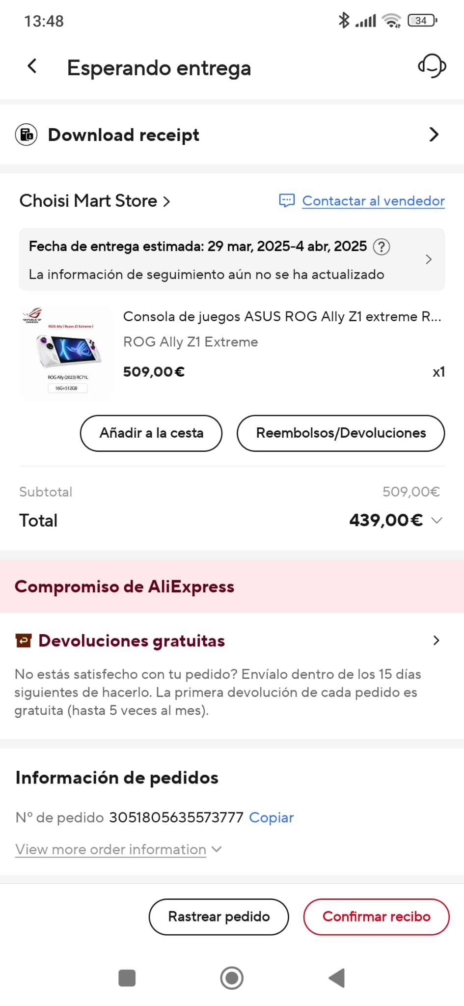 sinuba escribió:Tengo un problema, a ver si alguien me puede ayudar. Pillé una Rog Ally en AliExpress (envío desde Francia, así que en teoría debería ir rápido). Tras pasarse el tiempo de entrega estimado y ver que ni lo han enviado, les escribo y me dicen que están faltos de stock y me lo envían cuando puedan. Ok. Una semana después o así me pone que ya lo han enviado. Sin embargo, al poco me doy cuenta de que es un número de seguimiento falso que me indica que ya me lo han entregado, con fecha anterior incluso al día que ellos mismos me dijeron que todavía no lo habían enviado ¿Posible estafa? Iba escribirles, pero me contactan ellos mismos antes para decirme que el envío se ha perdido y que solicite un reembolso.