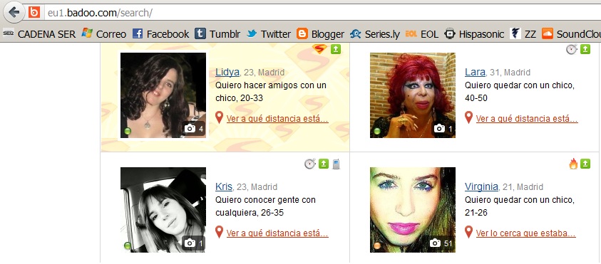 Ademas vive bastante lejos de donde yo, como 50 kilometros (no se como me saliera aquel dia si limito siempre la busqueda a 25) y la verdad es que hablamos mucho y reimos y tal, pero no es que sea de decir cosas cariñosas o hechar picadas o tal, es que en su busco ponia amistad y un rango de edad de 23 a 54 añospor eso no se muy bien a que atenerme...