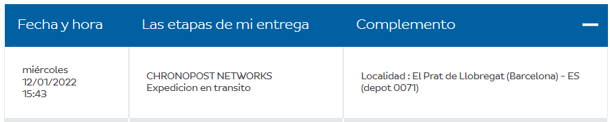 Y en la oficial de Chronopost con la APP me pone que suele tardar 6 días y no me pone tampoco lugar donde se encuentra