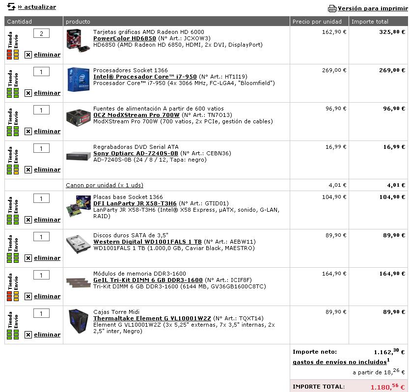 * I7 860 + GA-P55M-UD2 + 4 GB RAM + HD 1GB + PCIEX1GB 672€