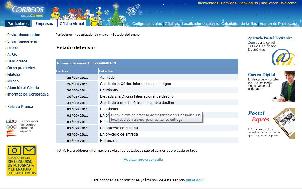 Creo que me lo deja mas claro correos.es, que al menos me dice que ha salido hacia entrega, mientras en EMS ya ves lo que pone... aunque la espero en estos dias, ya os pondre fotos de la preciosidad que pedi...
