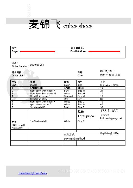 La ''factura'' que el vendedor nos entrega, pero rellena, NUNCA poniendo que hay ropa de marca. Y justo debajo me colocáis el importe de 175 USD que es el mismo precio que ya había puesto en la copia y pega de la factura de paypal.