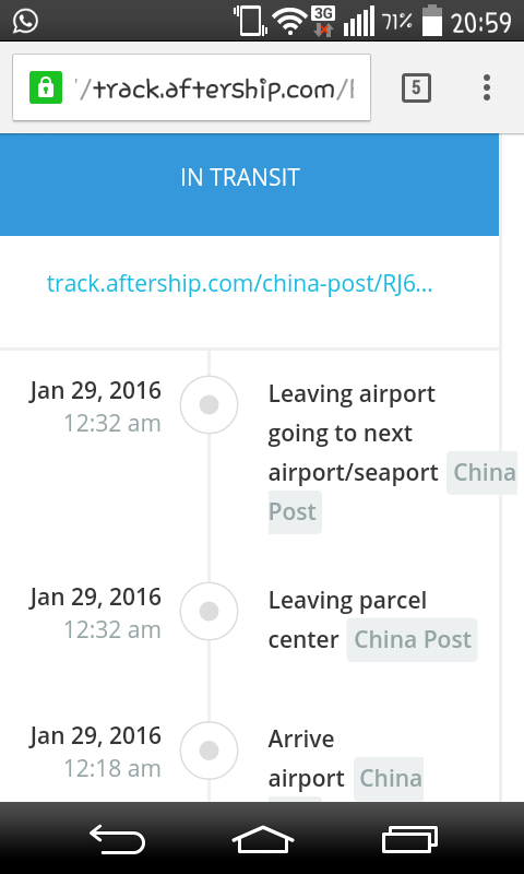 migueterry escribió:Otro que se une a la desesperación y eso que no llevo tanto tiempo como ustedes.. he realizado un pedido de un movil en Aliexpress, mediante un envio de Singapur post, y desde el día 5 me aparece Despatched to overseas, pero no puedo hacer nada para saber en que punto se encuentra exactamente, y he leído por ahí que el envio no tarda tanto una vez sale de allí a llegar a España, pero en la web por el track que les meto no aparece nada de que ha llegado.. No se si puede ser que se quede estancado el vuelo por el tema de las fiestas de año nuevo chino, pero me gustaría almenos saber donde se encuentra, me pongo en contacto con el vendedor (Que supuestamente era de los pocos que no cogía vacaciones), pero no recibo ninguna respuesta por su parte. Tengo realizado otro pedido de movil de mi pareja pero aún no ha sido enviado después de una semana...