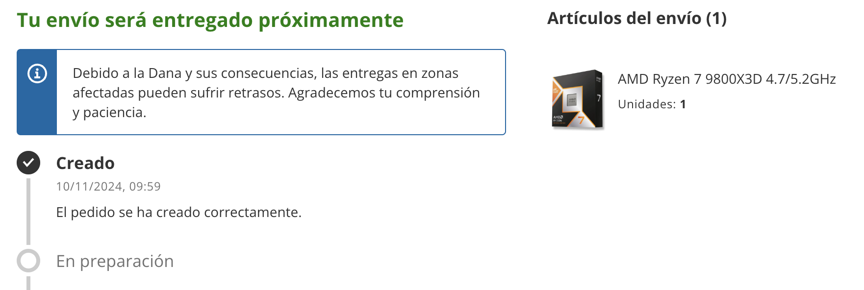 Raincloud escribió:@parh Lo he pillado con una 4080 super. Ya han vuelto a retrasar la fecha otra semana más (es el procesador 7600x que se ve que o están vendiendo demasiados o el stock que tenían puesto no era real).