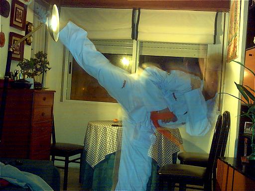 Alli estuve bastante tiempo, pero sin hacer examenes. iba a aprender, la competicion no me llama, asi que no tenia razon para gastarme las pelas en los examenes. Y es una pena, por que mi constitucion es perfecta para combate. 1,80 - 55kg, me falta fuerza, pero tengo agilidad por un tubo y unos reflejos de la hostia. esto lo descubri un dia en un partido de frontenis. iba por la pared a recojer una pelota, uno de los que jugaba saco, se le fui la pelota directo a mi, y segun escuche un "cuidad..." me medio gire, la vi venir y me dio tiempo a esquivarla. todo el mundo se quedo mirando y yo asustao, por que aquella pelota iba directa a la cara, y me hice daño en el giro. fue demasiado rapido.