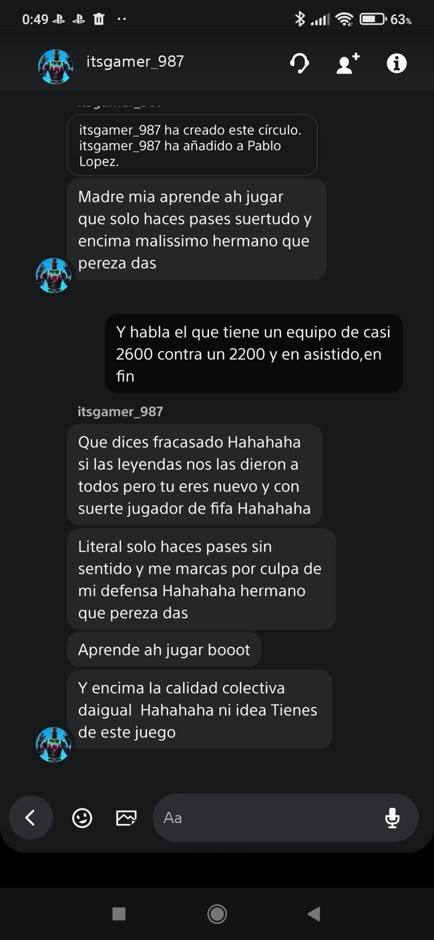 Hobson escribió:la gente esta muy malita,me enfrento a un tipo con un equipo de casi 2600 y yo con un equipo de 2200 que me hecho para probar jugadores sin subirlos de nivel,yo jugando en manual,quedamos 1-1 y me escribe este mensaje,le tuvo que doler
