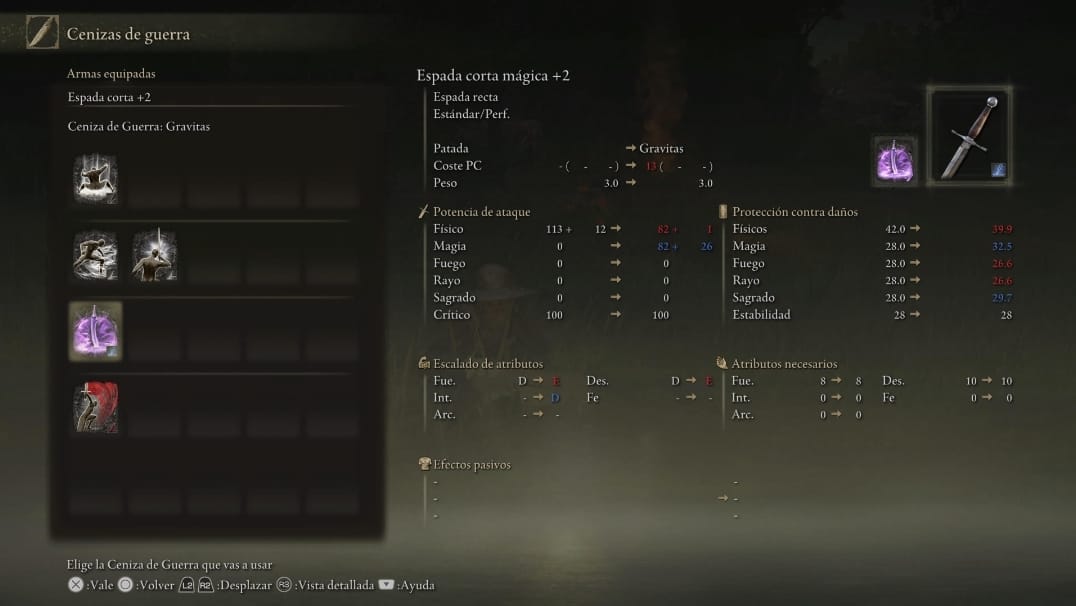 Si llevas en la mano derecha un arma con ceniza de guerra mágica, cambia el escalado a inteligencia, y su daño se aplica al arma, da igual el golpe que sea.