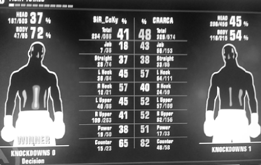 Mi anterior personaje que tenía en el peso medio era un fajador, vamos, tirar para alante moliendo al rival. Lo que hice fue apuntar cada derrota, por qué me sucedía; Mi record antes de borrarme el personaje era de 145 victorias y 46 derrotas.