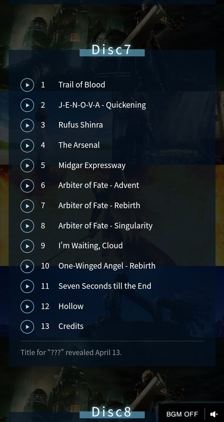 Alex_martell escribió:No se si alguien mas se ha dado cuenta, pero el subtitulo que le dieron en el primer juego a la cancion de One winged Angel fue (REBIRTH) por lo que sigo pensando que todos esos subtitulos en los titulos de esta compilacion de juegos tienen que ver con Sephiroth.