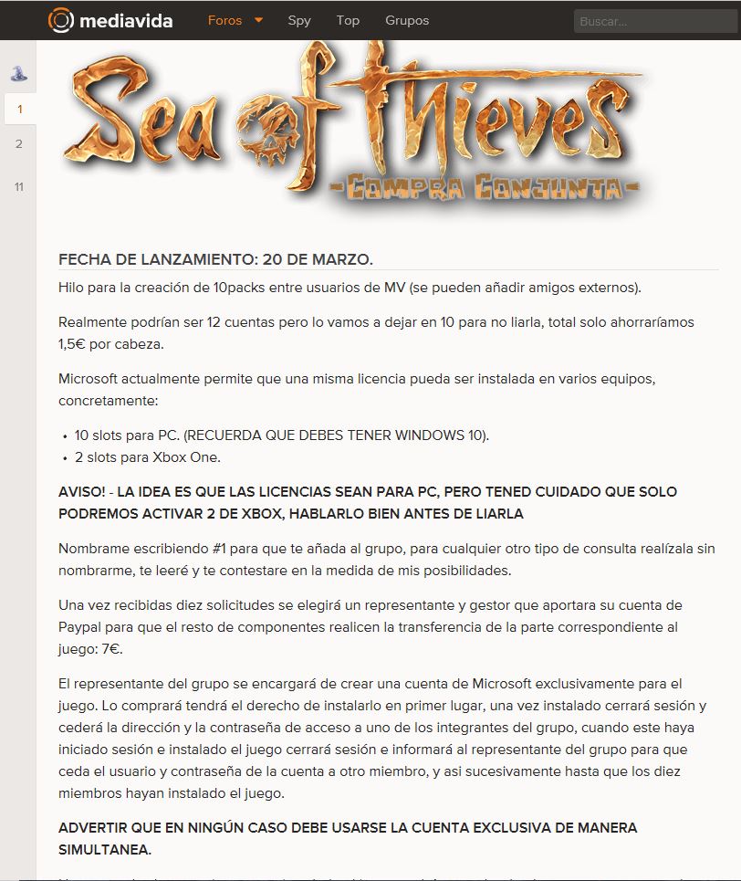 Keops99 escribió:Buenas. Abro nuevo grupo de Sea of Thieves. Estamos apuntados 9 y para completar el grupo solo nos quedaria 1 hueco mas de PC y los 2 de XBOX. EL precio solo es de 3.70. Saludos.=========================================================================================