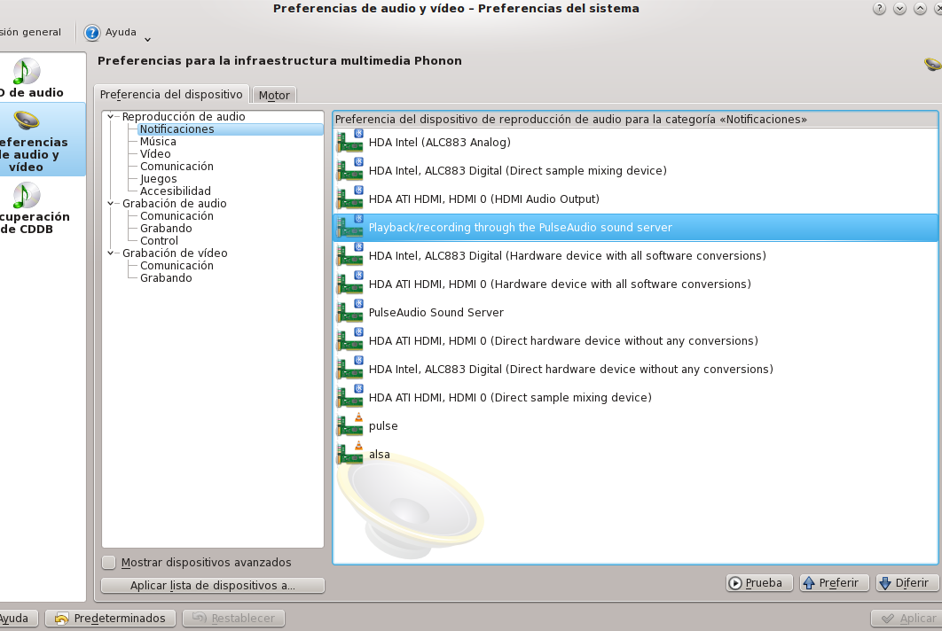 Si usas puseaudio, te puedo decir que yo tengo puesto como principal (el primero de la lista), Pulse Audio Sound Server. Si no quieres tener que modificar uno por uno, selecciona a la izquierda el apartado, p.e., Reproducción de Audio, y mira abajo a la derecha donde dice "Aplicar dispositivos a...", ahi te saldrá una lista con todos los que incluya y puedes decir que use la misma configuración para todos. Después, posiblemente, tendrás que configurar en kmix cual es el canal maestro y esas cosas.