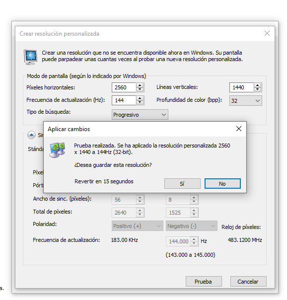 Si en el panel de control de nvidia creo una resolución personalizada y especifico los 144 Hz, aparece una ventana que dice "Prueba realizada, se ha aplicado la resolución persolizada ¿desea guardar esta configuración?"
