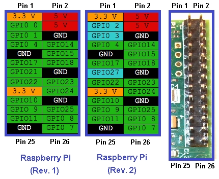 Para más detalles, mira la imagen adjunta que indica qué pines hay en las revisiones 1 y 2 de la Pi.