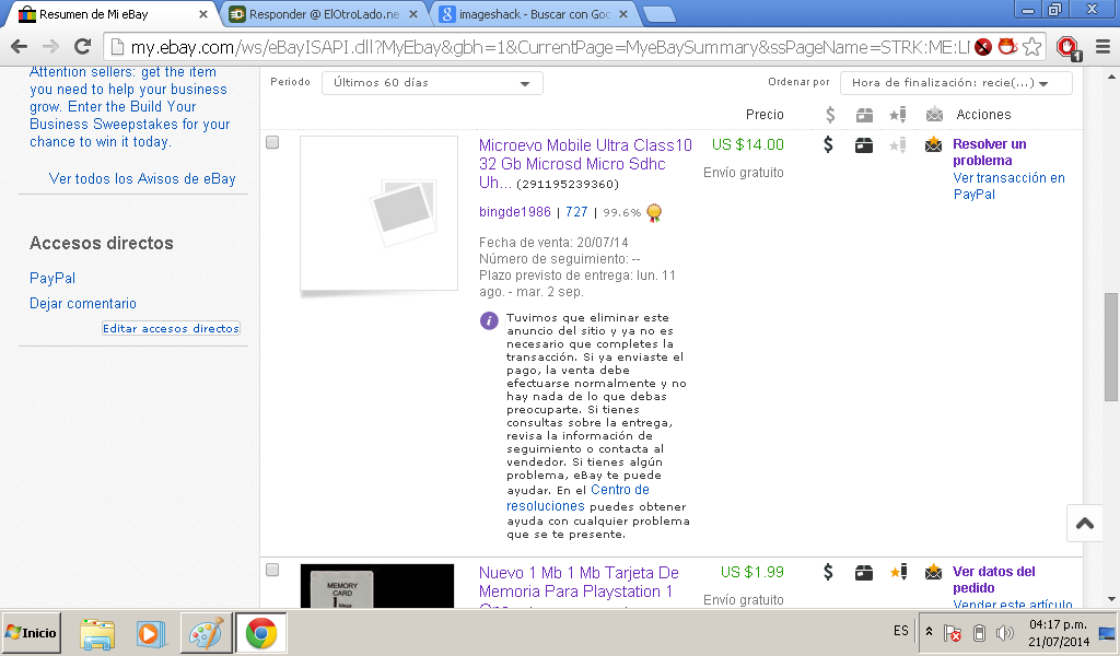 aleso escribió:Bueno no me ha contestado el correo que le mandé al email que me proporciona paypal del vendedor ni tampoco el mensaje que le mandé por ebay.