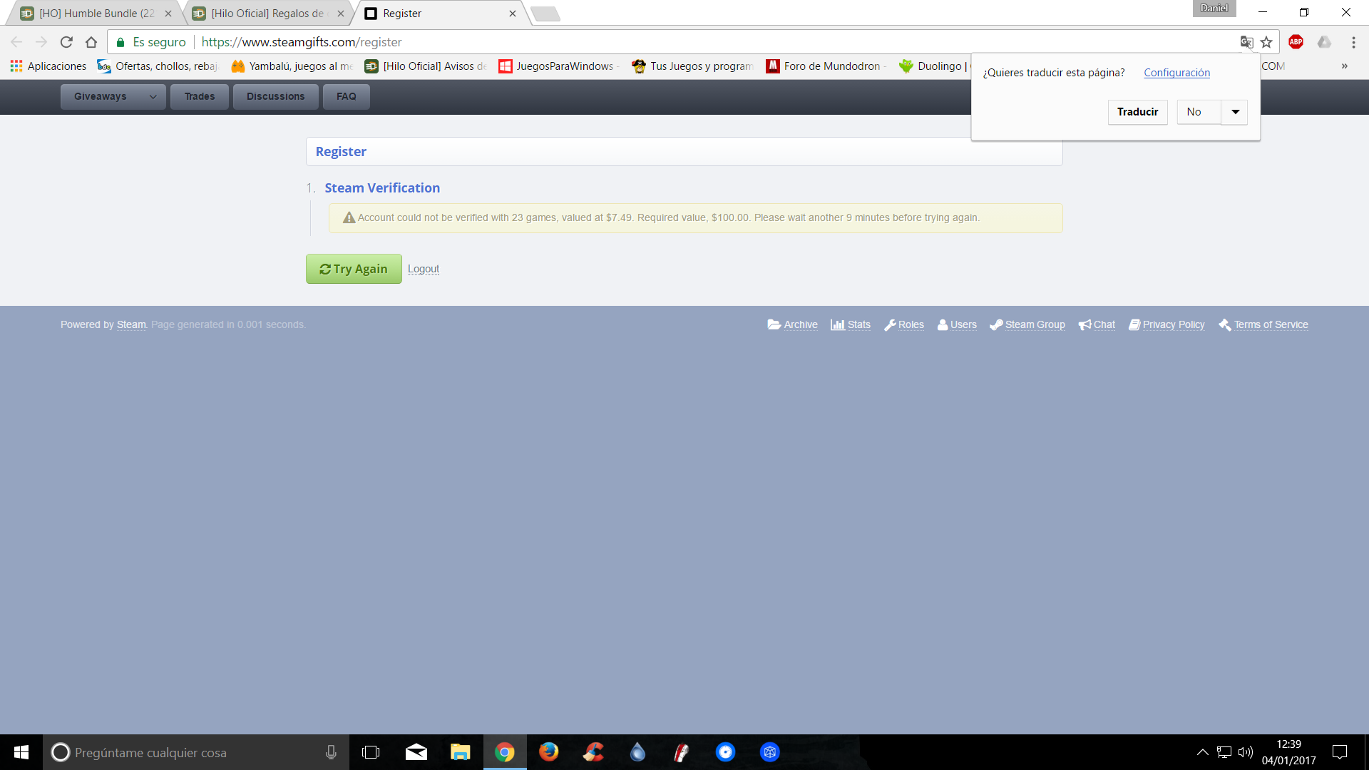 La valoración de los juegos de tu biblioteca debe superar los 100$ y esa valoración no es la de Steam sino la de SG (bundle=15% del valor real, juegos gratis=0$).