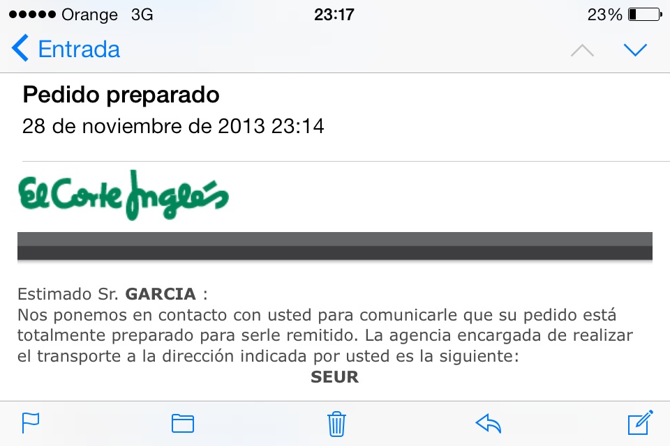 no se si es que hablas por hablar o cuál es la razón. Yo compro asiduamente online en el corte inglés, y es LA PRIMERA VEZ que no me notifican un envío ni tengo información del mismo. En otros envíos de ropa, electrodomésticos o cualquier cosa, me envían un SMS y email cuando se envía, y si es el caso de entrega en un centro eci u opencor, días antes me confirman que en breve me avisarán de que mi paquete estará disponible.