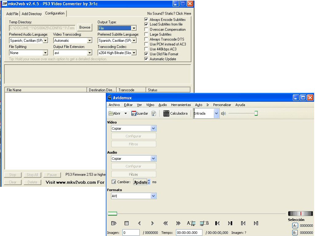 Os pongo pantallazos de la configuración del mkv2vob y del avidemux.pantallazo.jpg