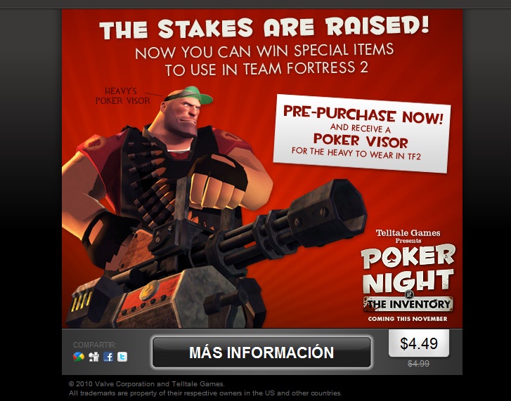 Mr.Gray Fox escribió:saddarkboy escribió:pues me acaba de salir el banner de poker night at the inventory y aparece la leyenda "now you can win special items to use in team fortress 2" Y están dando un gorrito "visera de poker" para el heavy, pero lo que me llama la atención es el arma que trae el heavy, que no es ni sasha ni natasha, les dejo la imagenheavy´s gun.jpg