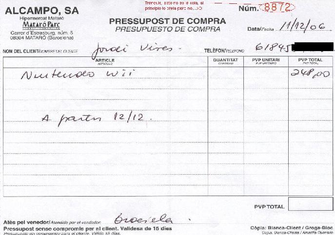 Yo me quedé sin una el martes 5 a las 8:05 de la mañana en el Opencort, el chaval que iba delante mía se llevó la última ante mis narices. Me fui al curro y al salir me pasé por Alcampo para echar un vistazo ya que por aquí lei que en algunos sitios habian sacado consolas por la tarde. Al llegar había un montón de cajas vacias y un cartelito de reservas, como no tenía nada que perder fi a reservarla. Me apuntaron en un cuaderno pestosete de esos de colegio, el nº 30 y dijeron que me llamarían.