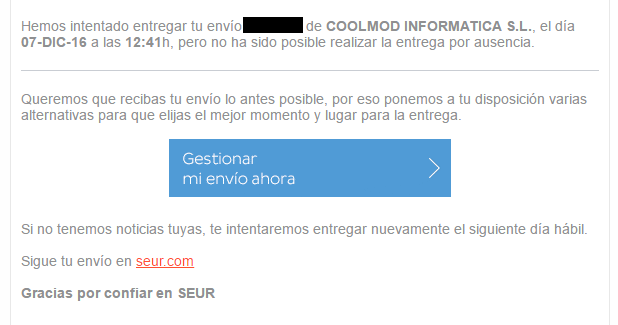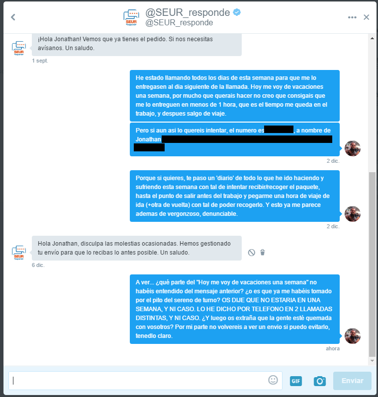 Si yo se que el problema no es vuestro más allá de confiar en la sarta de inutiles y retrasados estos de SEUR, que ya de verdad es que NO TIENE NOMBRE. 2 Llamadas, DM a traves de Twitter Y AUN ASI INTENTAN ENTREGARLO EL DIA QUE LES DIJE QUE NO ESTABA.