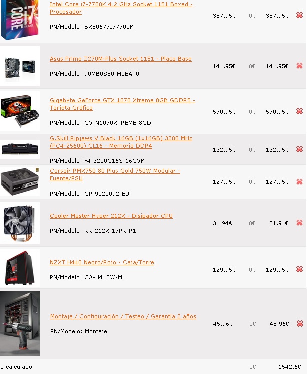 He ido a la página y he puesto lo que sabia, que es poco, pero me falta placa base (nosé si es mejor una Asus o Gigabyte), fuente, disipador y caja.