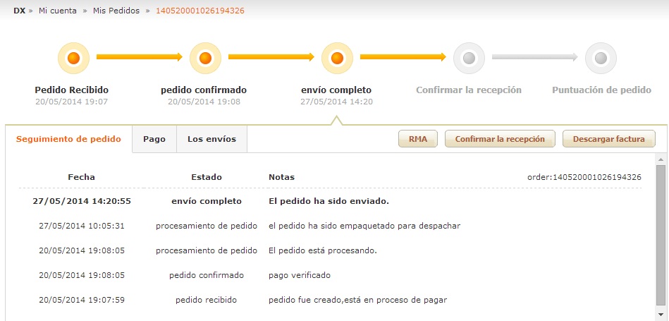 luyramirez escribió:hola dx, en el mes de febrero compre dos fundas para la tablet samsung galaxy tab 10.1" PEDIDO: 140207001097967926". Por error me enviaron la del modelo Samsung Note 10.1. Me puse en contacto con DX.com, me enviaron unos códigos para la devolución del mismo "RMA: 140207001097967926R00", al mismo tiempo le hice las fotos del producto, embalaje y el envió, se hizo el 21 de abril. Aun sigo esperando devolución del dinero u las fundas correctas. Te envio numero de ticket del rma: