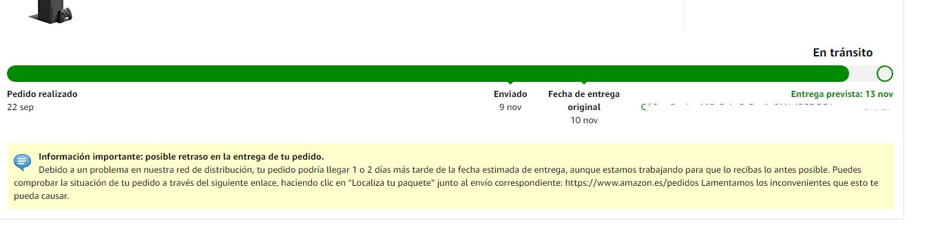 A mí en cada uno de los artículos (consola, mando, carga y juega, assassins creed y yakuza) me pone “Entrega hoy”, y si pincho en cualquiera de ellos se me abre otra ventana en la que aparecen todos los artículos juntos, poniendo en la parte de arriba “Prevista antes del 10 de noviembre”, y en la parte de abajo “Lo sentimos, tu paquete se ha retrasado. Ponte en contacto con Amazon para obtener ayuda”...