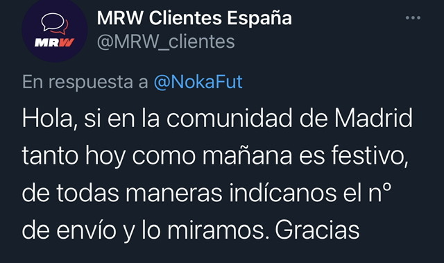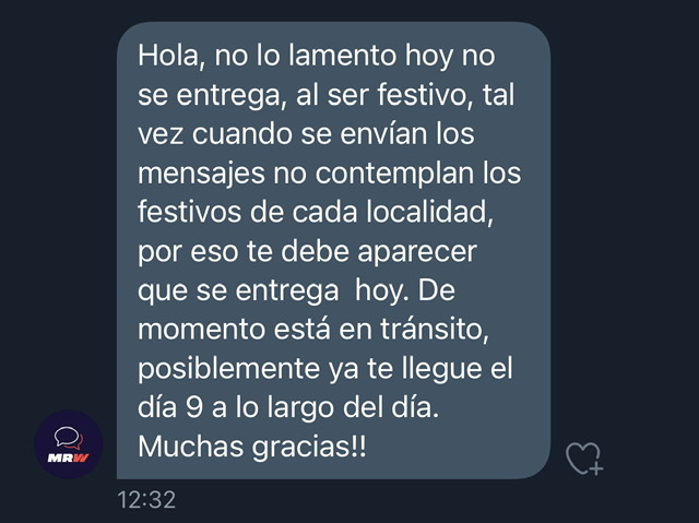 Ahora llegan los problemas, al ver la hora que es y que solo reparten hasta las 14 en Valencia, he decidido llamar a mi oficina más cercana de MRW y cuál es mi sorpresa que me comentan que no solo no está en reparto el paquete, si no que ni si quiera lo han recibido en el almacén y no saben nada de él, que llame esta tarde sobre las 17 a ver... No sé que hacer, estoy cabreadisimo