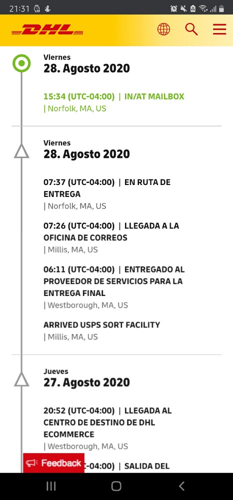 Mail con el seguimiento antes de ayer pero aún hoy no funciona el seguimiento, llamando a dhl (la normal) no saben nada del paquete, quizás sean otra empresa distinta.
